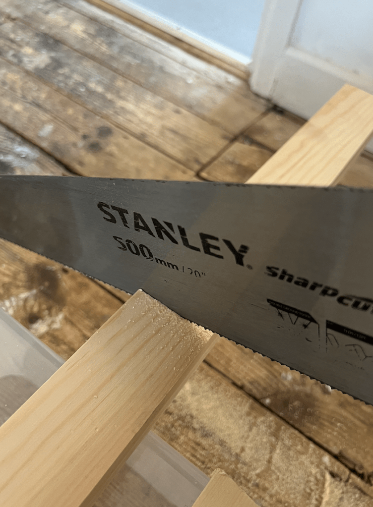 B&Q have a really amazing free cutting service when you buy wood from them (you get five free cuts and the next ones cost 50p each). I took full advantage of this for my shelves, giving them the dimensions and getting perfectly straight cut shelves. If you don’t have this option, ask around your family for someone who has a power saw as this will give you a much better finish than a hand saw. But you will need a hand saw for the next bit…